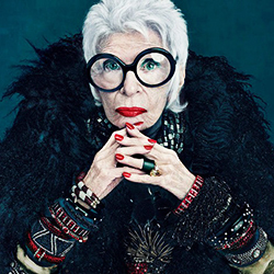 Теперь этот возраст можно считать детским. Настоящий фурор в рекламе косметики произвела 90-летняя дерзкая любительница моды Айрис Апфель. Она представляла новую яркую линейку косметической марки MAC Cosmetics. В презентации по поводу этого было написано буквально следующее: «Насыщенная цветом коллекция, в создании которой участвовала редкая птичка, всегда летящая впереди времени».