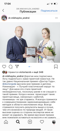 «Доктор года» в этому 2019 году признали Михайлова Андрея Анатольевича лучшим хирургом по пластике лица! И эта премия заслуженна и оправданна его трудом и старанием. Мы, его пациенты, наградили его этим званием даже раньше премии года, за наши красивые результаты! На операционном столе он создает красоту и счастливых женщин.
