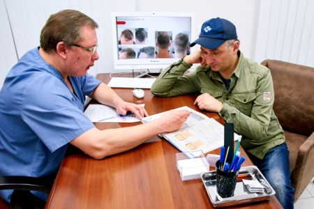 Пластический хирург Василий Буянов отметил, что основной недостаток волос наблюдается на макушке и на лбу. Для коррекции было принято решение выбрать комбинированную методику — уплотнит волосы на макушке путем консервативной терапии, а в область лба пересадить волосы с затылочной части при помощи технологии MFT. Как проходила сама процедура и как чувствовал себя Александр Пряников, вы можете увидеть в фоторепортаже.
