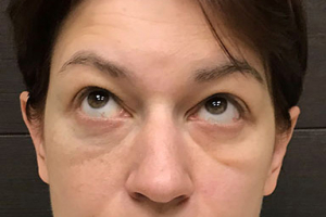 У пациентки имелись возрастные изменения периорбитальной зоны, а именно излишки кожи, жировые выпячивания верхних и нижних век; припухлости в области скул или «малярные мешки», образованные избыточной провисающей жировой клетчаткой. По желанию пациентки избавиться от нависания верхних век и мешков под глазами я выполнила круговую блефаропластику и липомоделирование малярной области.