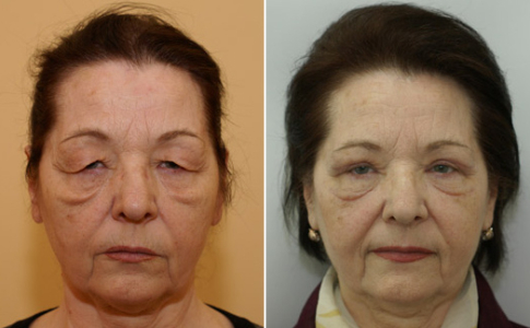 И наконец, еще один случай. Пациентка много читала на тему блефаропластики. На консультации она попросила, используя методику пластики нижних век, перераспределить грыжи под глазами. Я объяснил, что с возрастом опускаются мягкие ткани лица, что у пациентки и произошло. В результате — оголение нижнего края орбиты. Чтобы устранить данный эстетический недостаток совместно с пациенткой было принято решение выполнить подтяжку средней зоны лица и пластику век одновременно. После подтяжки лица и пластики верхних и нижних век пациентка получила желаемый результат — омоложение лица и глаз.