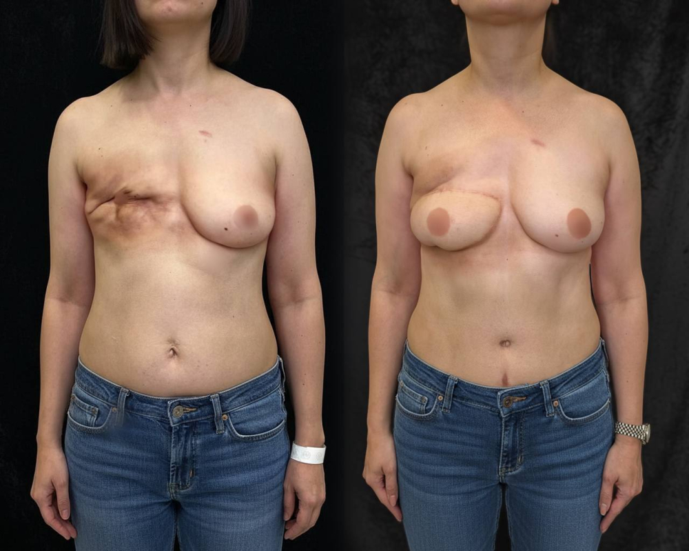 Дмитрий Мельников о пациентке на фото: Бывают случаи настолько непростые, что мы сами не знаем, с чем столкнемся в процессе. Эта пациентка пришла с ужасными последствиями лучевой терапии. Кожа была тонкой, поврежденной, натянутой на ребра. Полное отсутствие каких-либо адекватных тканей. В такой ситуации решение было одно — замещать. Никакой имплант невозможно поставить с таким исходником. Новую грудь мы сформировали из лоскута живота, а большую часть облученной кожи убрали. На месте забора лоскута сделали абдоминопластику. Самое крутое — это то, что (как это часто бывает) несмотря на сложный исходник, пациентка пошла до конца: восстановила сосок, сделала перманент. И, в целом, получила самую обычную женскую грудь, которая выглядит и ощущается так, как и задумано природой.