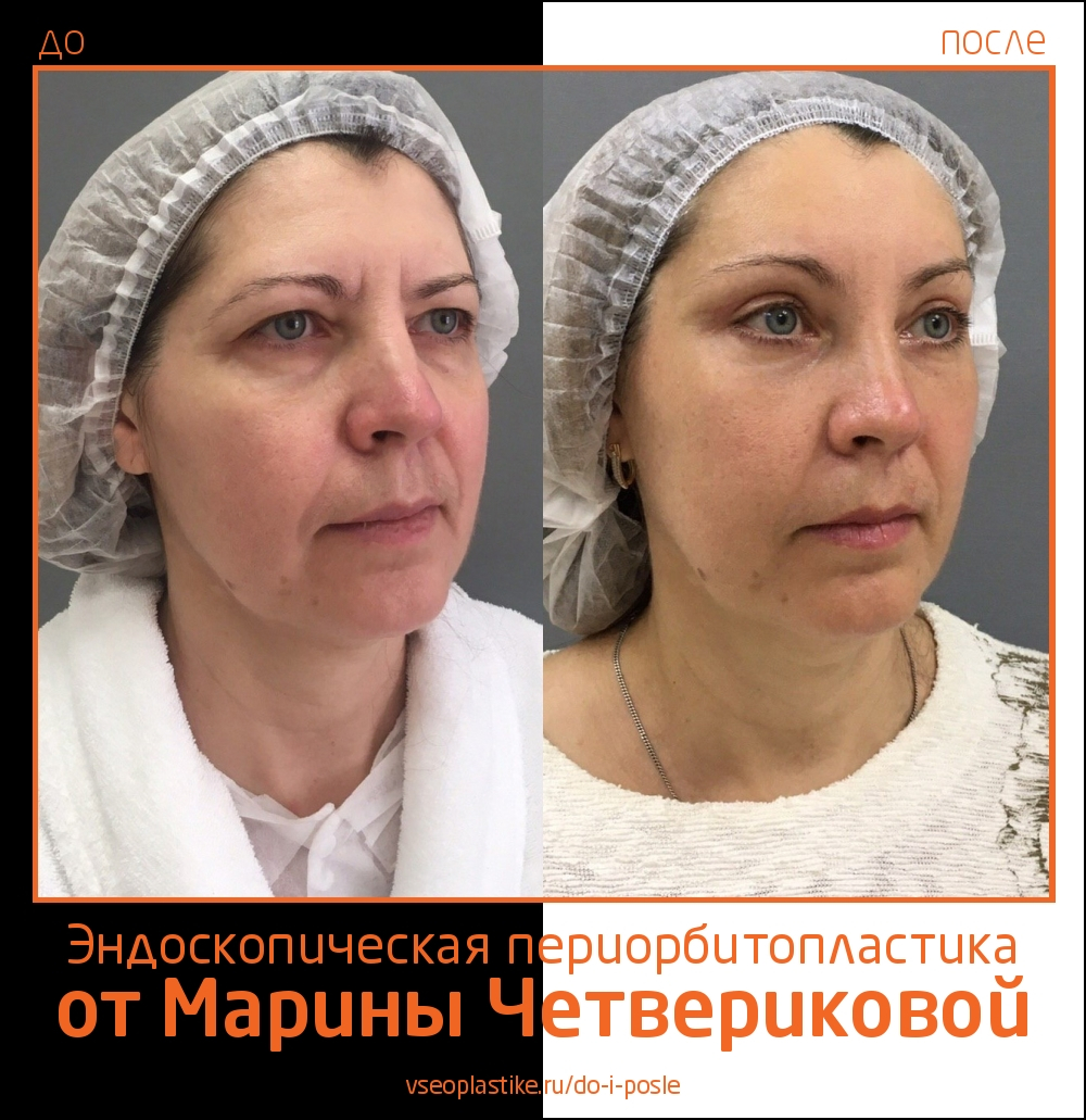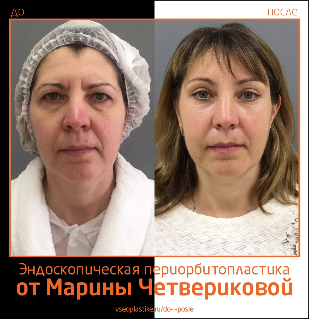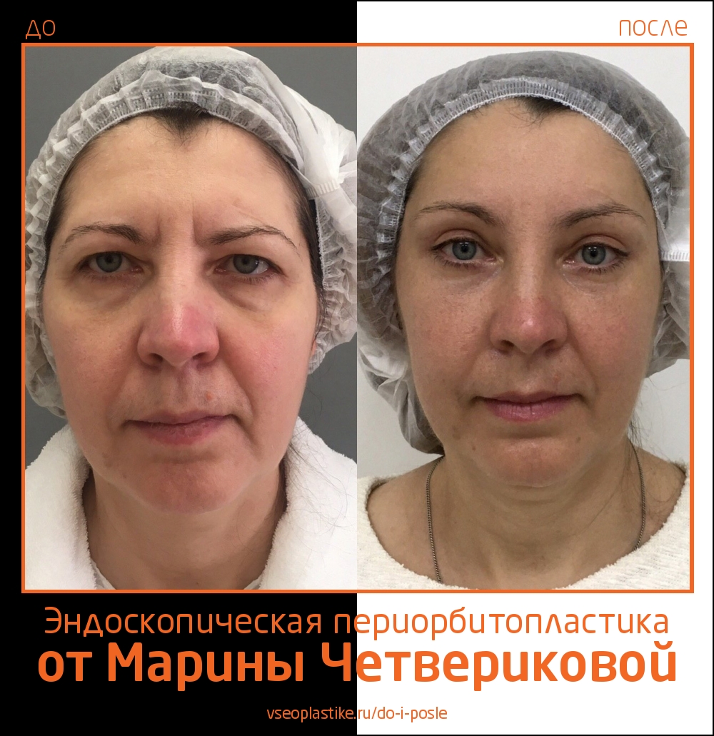 Пациентке Марины Анатольевны Четвериковой была выполнена эндоскопическая периорбитопластика, верхняя и нижняя блефаропластика. Фото через 4 месяца после операции.