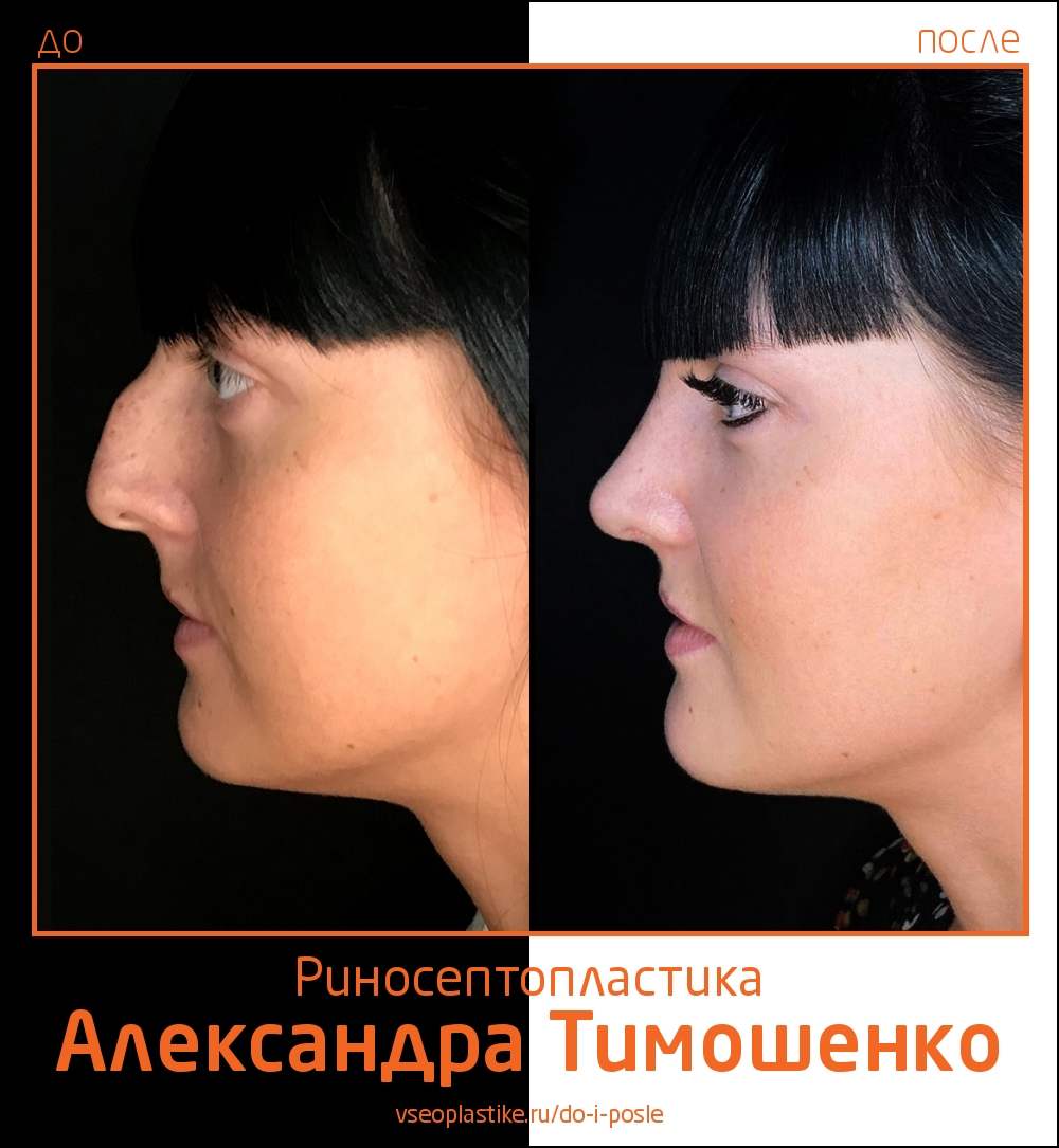 Доктор Александр Тимошенко безупречно выполнил риносептопластику, благодаря которой у пациентки восстановилось правильное дыхание. Пластическая операция позволила из горбатой спинки обонятельного органа сделать прямую, при этом специалист чуть-чуть приподнял и уменьшил кончик носа. Трансформация из травмированного в утонченный и эстетически красивый нос у пациентки прошла успешно.