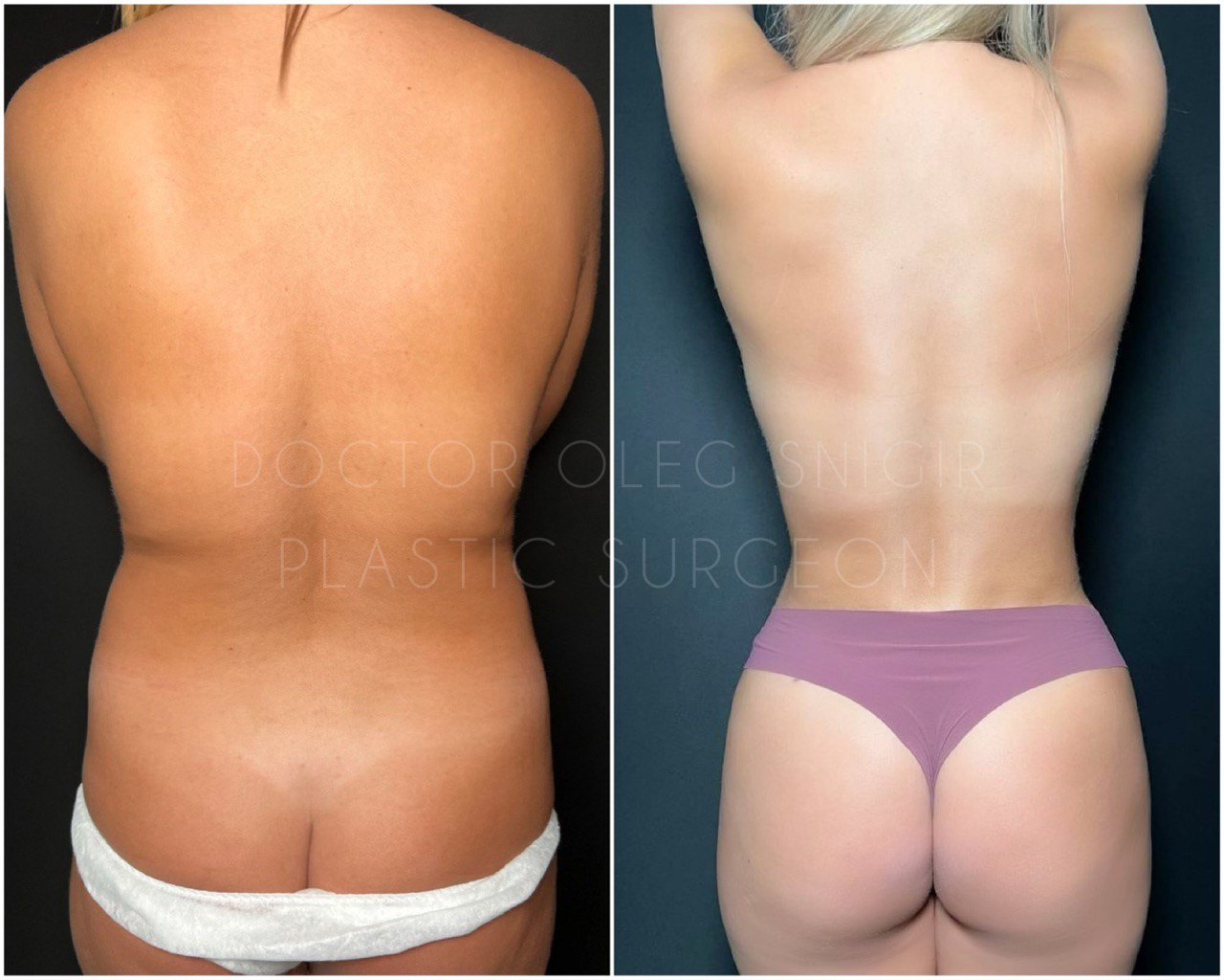 Доктор Снигирь выполнил липосакцию 360 градусов с прорисовкой спортивного рельефа мышц пресса. Грамотно подобранное хирургическое решение обеспечило великолепный результат в виде стройного телосложения и соблазнительных женственных контуров.