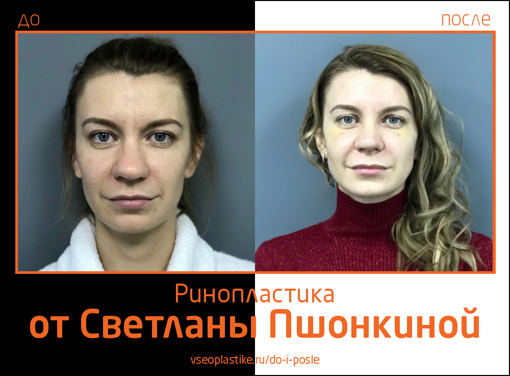Благодаря ювелирной работе доктора Пшонкиной пациентка получила аккуратный изящный носик, изменивший её лицо в лучшую сторону. Снимок «после» снят через неделю после ринопластики. Отсутствие характерных для этого реабилитационного срока синяков и отёков объясняется щадящей методикой, которую в своей работе использует Светлана Пшонкина.