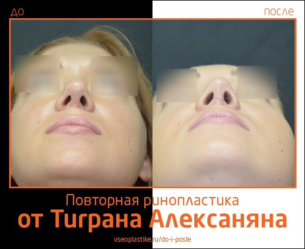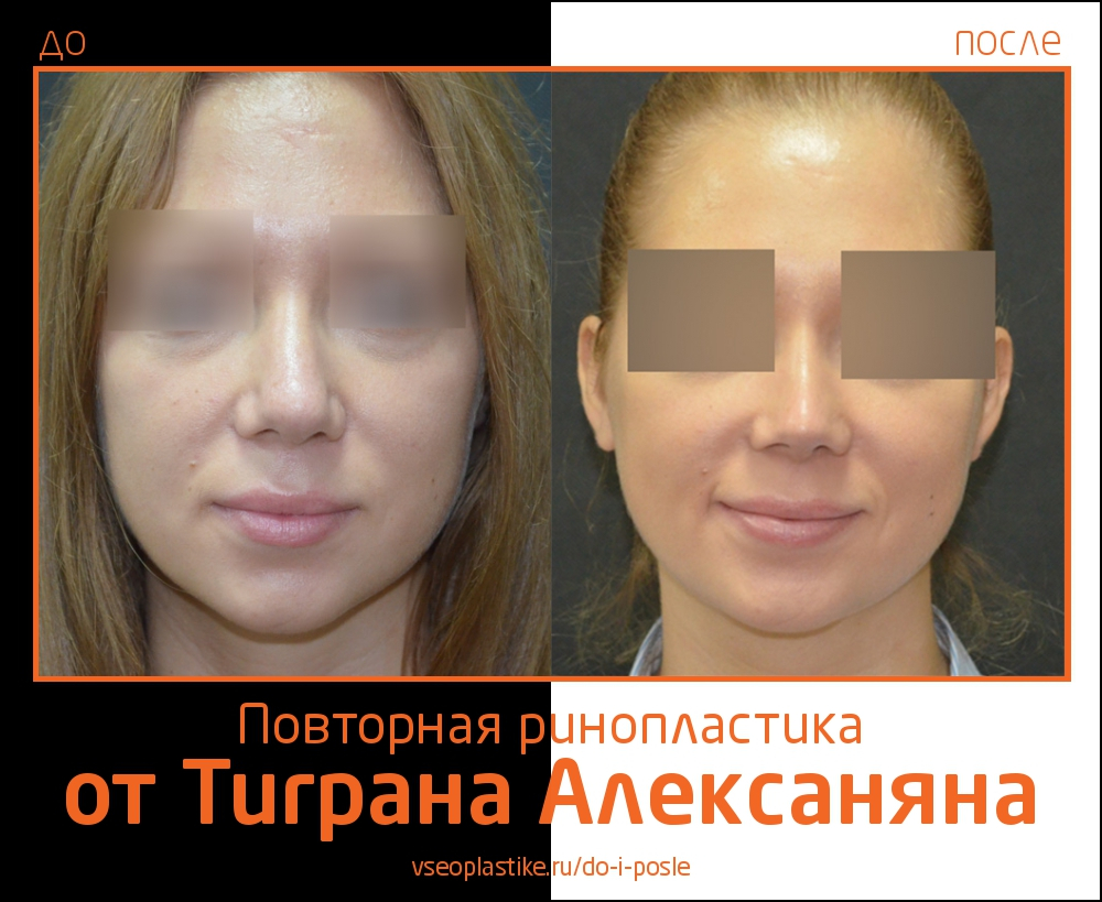 Пациентка Тиграна Алексаняна до и после повторной ринопластики. Данные снимки дают возможность оценить динамику произошедших изменений.